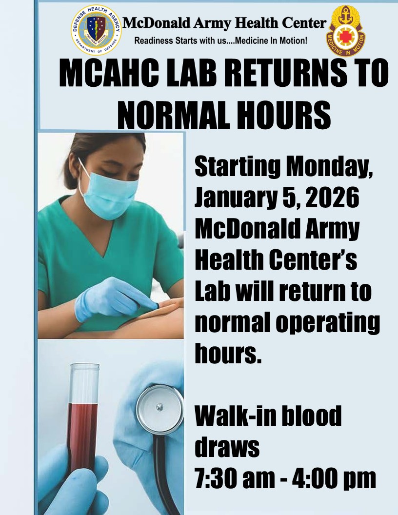 Effective health care is based on medical evidence and the McDonald Army Health Center laboratory performs the tests which provide much of that evidence that ensure your good health, or find the problems that threaten it. From initial sample to final result, the McDonald Army Health Center lab provides caregivers medical information that supports your health.